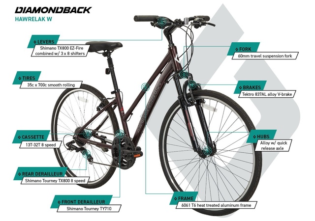 The Diamondback Hawrelak 700C Bike offered in a step-through option makes it easy to mount and dismount, while bringing you a versatile ride that will suit you well if you are looking to commute to work or, enjoy Saturday afternoon pathway rides with the family and all sorts of riding in-between. The Diamondback Hawrelak is designed for comfort and safety with the suspension fork and suspension seat post to smooth out those bumps in the road, and the adjustable stem means you can get the handlebars right where you want them.