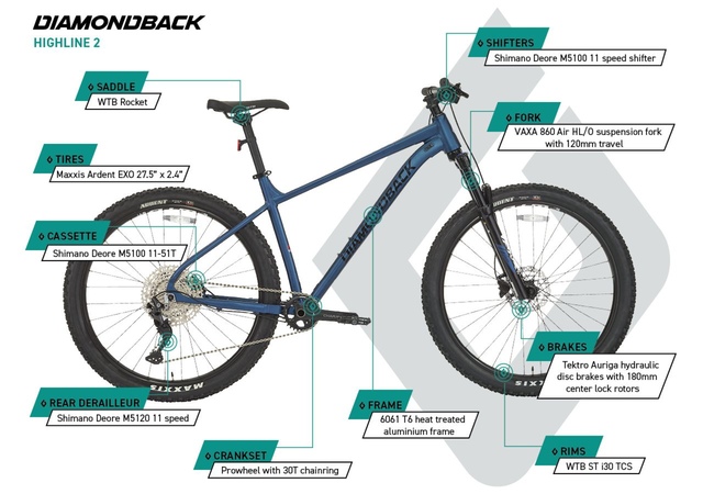 The Diamondback Highline 2 blends design with function. Built with high-end quality components throughout the lightweight aluminum frame, the high-quality drivetrain features Shimano Deore 11 speed drivetrain to provide a superior feel while changing gears on the trail. Riding on 27.5” Maxxis Ardent tires with a Vaxa 860 Air 120mm travel suspension fork that features an adjustable air spring, and paired with Tektro hydraulic disc brakes - the Diamondback Highline 2 is ready to roll over anything!