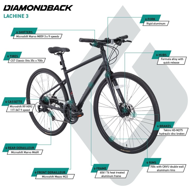 Lightweight 6061 T6 aluminum frame with Diamondback's formed tubing features optimised wall thickness for a balance of strength, weight, and stiffness that translates to a responsive and reliable ride leisure/fitness rides, or getting from point A to point B, the Lachine 1 will take you there swiftly.