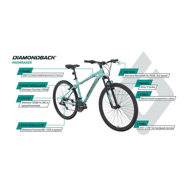 The Diamondback Moonraker 27.5" bike is a great choice for someone starting out in mountain biking. The lightweight hardtail design, quality Shimano components and 18-speed drivetrain provides the rider with a versatile bike that is great for riding around the neighborhood and will also handle well on recreational trails.