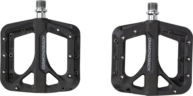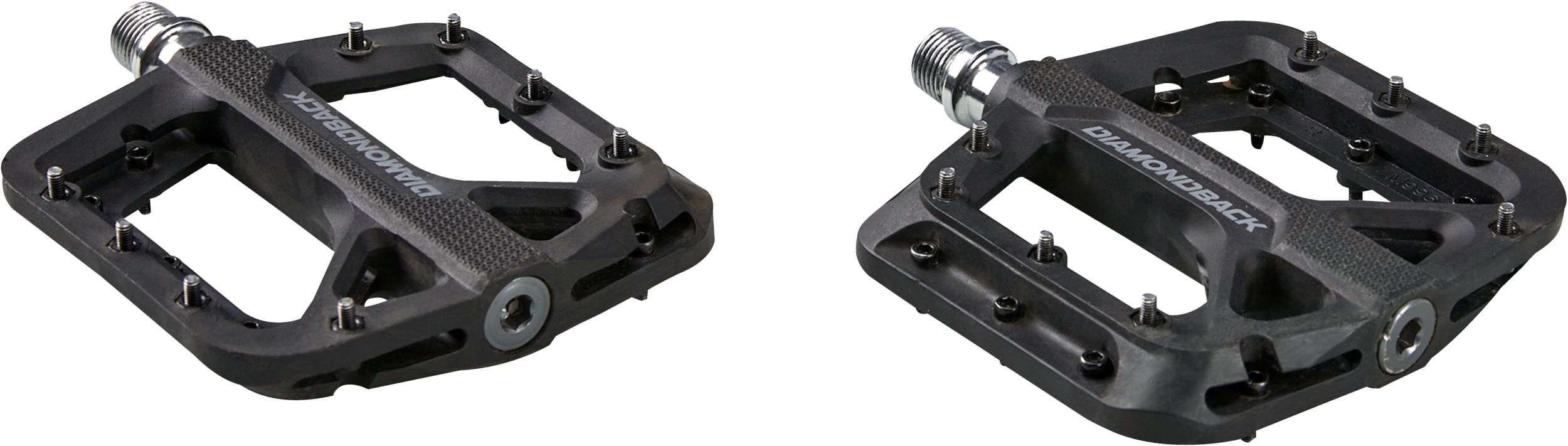 Pedals made for the trails. The DiamonBack mountain bike pedals have a platform of 106mm x 100mm surface area, which is optimized to ensure your foot stays planted to power through every turn. The pedals simultaneously allow for a small profile with their 15 mm thin design and high performance with the premium sealed bearing system. Perfect for gravel grinders, long trail rides, or just exploring the mountains. Explore the roads less traveled with the new DiamondBack mountain bike pedals.