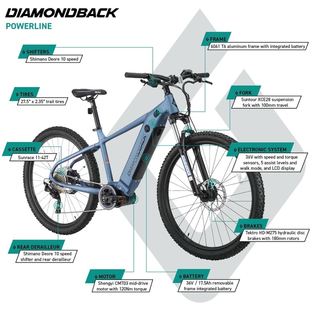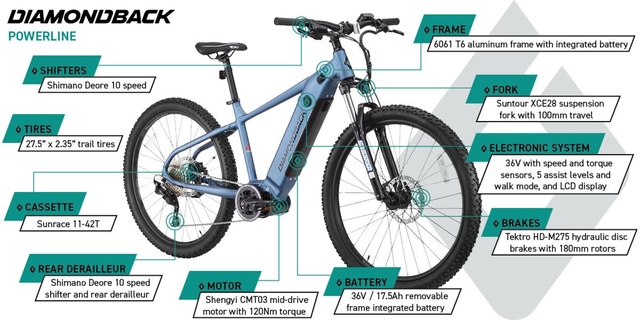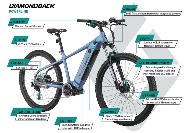 Have you wanted to experience the thrill of mountain biking but are not thrilled with the idea of having to do all the work up the climbs? Look no further than the Diamondback Powerline electric-assist bike. With 5 different levels of pedal assist, plus a walk mode, you can choose when and how much power assistance you receive. A Shimano 10-speed drivetrain provides reliable gear changes. The Suntour 100 mm fork provides front suspension to smooth out the rough trail, and hydraulic disc brakes give more powerful and consistent braking performance; especially in variable conditions for those wet and muddy days. Whether you’re looking for a fast and easy ride into work, exploring non-paved trails or venturing up (and eventually down) the mountain trails, the Diamondback Powerline Mountain Bike with Electric Pedal Assist will have you enjoying a new sense of freedom and fun.