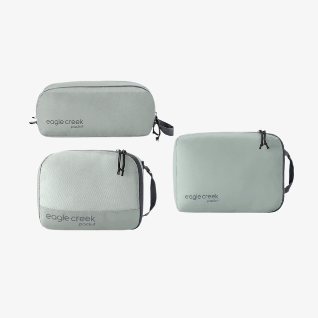 The Eagle Creek Pack-It™ Overnight Set includes three cubes made from 100% recycled fabrics. The set contains a toiletry bag with two compartments and a zippered mesh pocket, a clean/dirty cube for separating clothing, and a mesh-sided compression bag for compressing clothing. This Overnight set helps organize essentials and travel accessories for short trips.