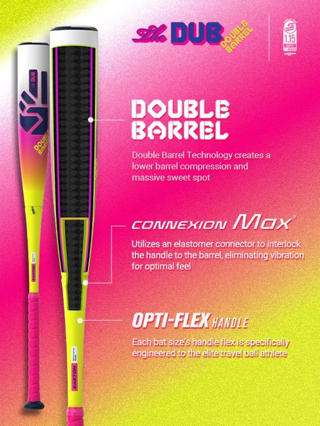 The Easton The DUB USSSA 2-3/4 (-10) Baseball Bat is designed to deliver unmatched power and speed. Featuring Easton’s Double Barrel technology, it provides an extended sweet spot and enhanced barrel performance for optimal ball exit speeds. The two-piece composite construction absorbs vibration for a smoother feel, while the ConneXion Max connection maximizes energy transfer on contact.