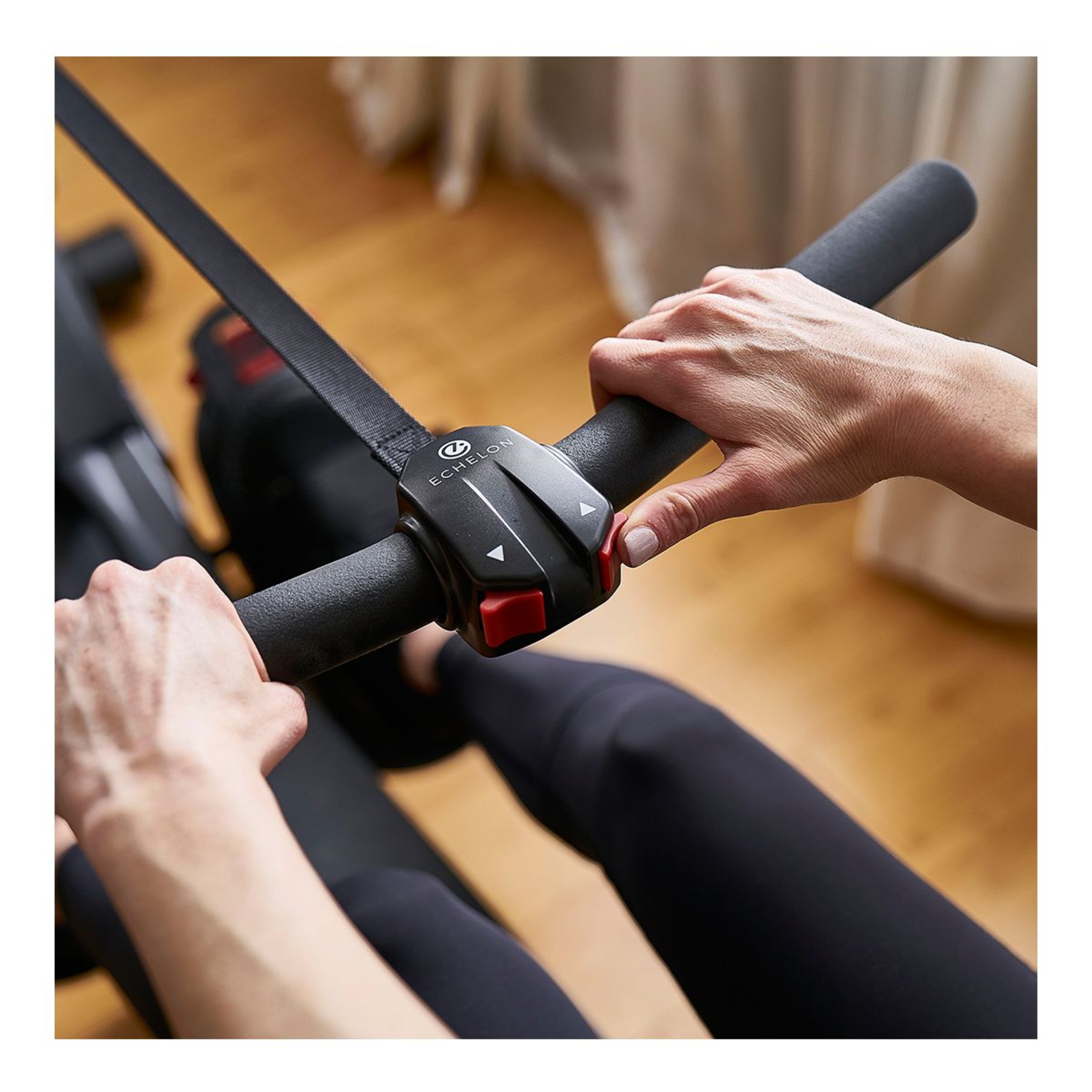 Foot platforms adjust to foot size with Velcro strap to secure foot