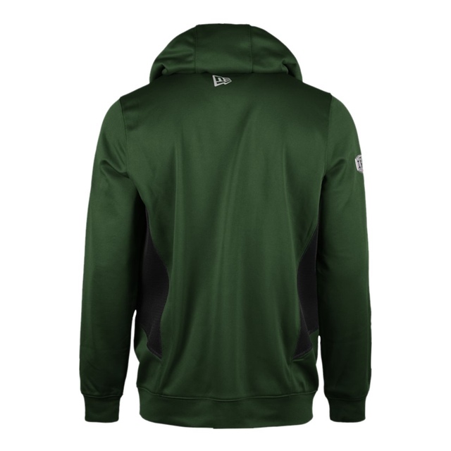 Edmonton Elks Sideline Clutch pullover hoody. Poly performance fleece fabrication. Team color with secondary team color flash on front shoulder. Athletic styling with mesh inserts on the hood and side gussets. Front hand warmer pocket and elasticized drawstrings on the hood. Full size primary logo screen on front centre chest. Also features CFL badge on left sleeve and reflective Official Sideline tab on bottom hem.