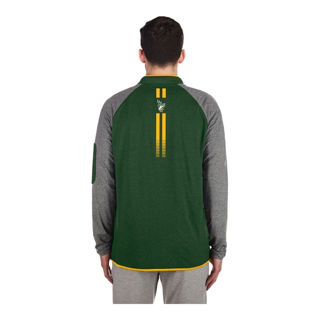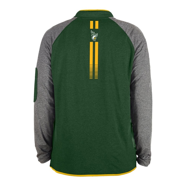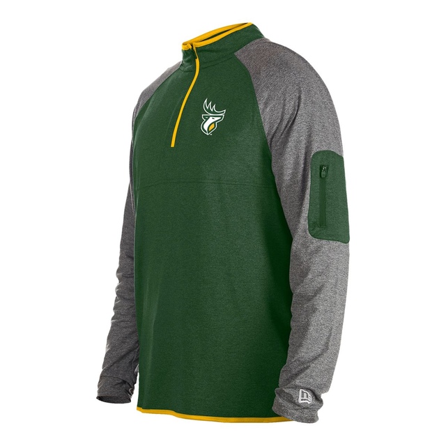 Edmonton Elks quarter zip fashion top. Team colour body with heather grey sleeves and secondary team color trim. Lightweight performance fabrication. Elks primary logo screened on left chest with speed stripes and logo screened vertically on center back. A small zip pocket on left sleeve finishes up this clean look top.