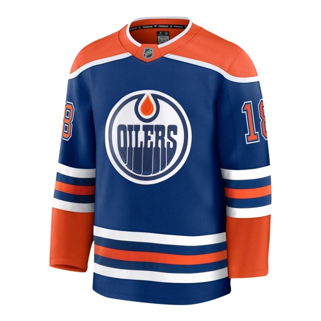 The Edmonton Oilers Fanatics Zach Hyman Home Jersey offers passionate hockey fans an authentic on-ice look. This premium jersey boasts high-quality details like recycled polyester construction, stitched tackle twill, and a vibrant embroidered crest for a true look and feel. It delivers the perfect blend of team pride and sustainable style.
