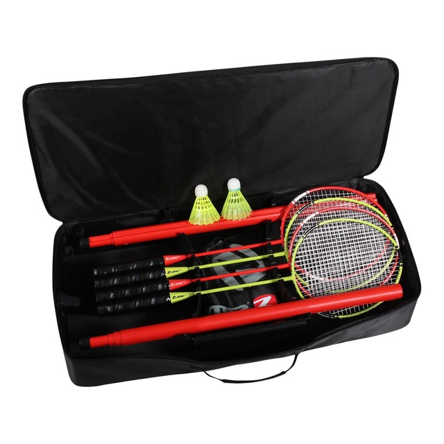 Includes four rackets (two red, two green), two shuttlecocks, net, and carrying case