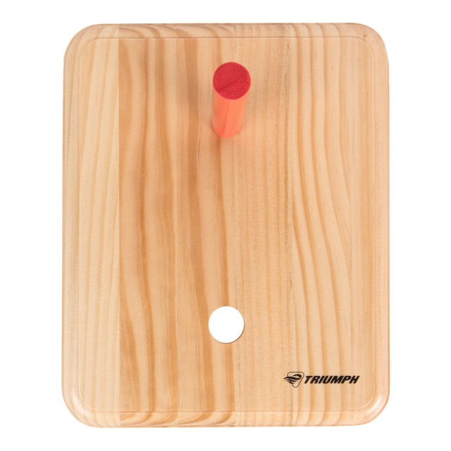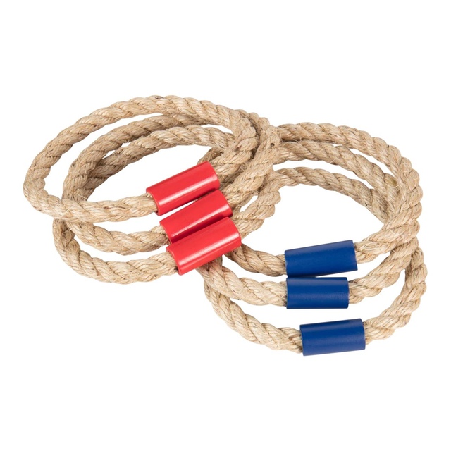 The Triumph Wood Quoit Set is a safe, fun toss game that plays like horseshoes with sisal rope rings. Matches are played player against player or in teams of two players each. The tournament quoit pitching distance is 21 feet between pins but this quoit set can be played at any fun pitching distance. Points are scored by tossing ringers (3 points) or landing rings on the wood target platform (1 point). The targets are designed to stack with the six rope quoits (3 red and 3 blue) wrapped around the two pins for convenient storage. The stackable solid wood targets feature 9" pins.