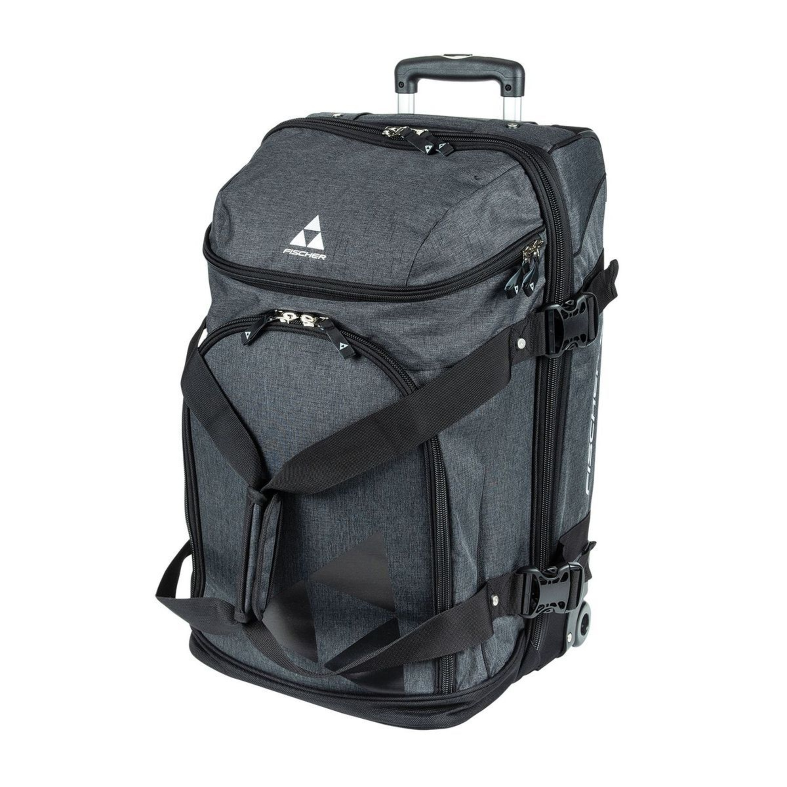 All the advantages of our larger team bag in a 93 liter package that also rolls on silent wheels. Expandable compartments with front load access, removable zippered divider between top and bottom storage areas make packing and access easy. Molded feet let it stand upright whenever you need. A soft grip on a telescoping handle lets you move in comfort.
