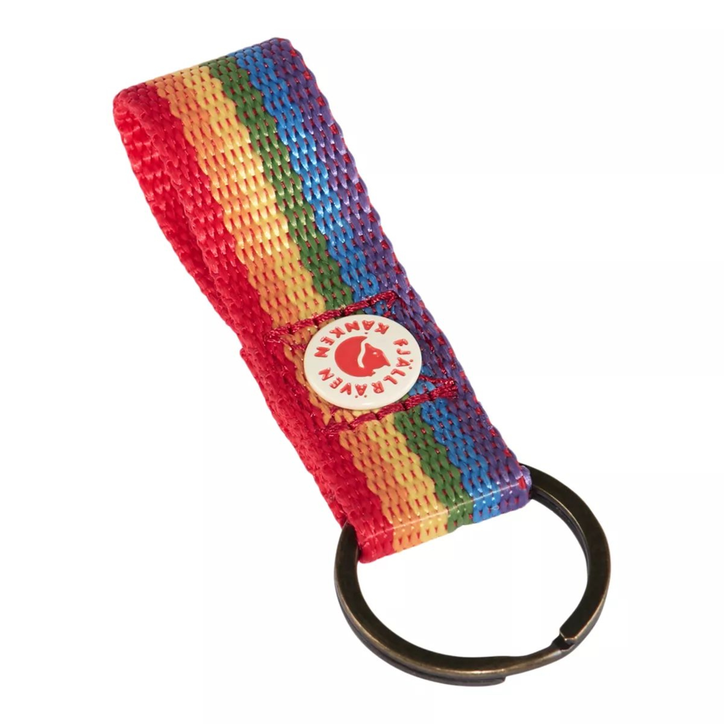 The Fjallraven Kanken Key Ring is constructed from polypropylene. It features a metal rivet with the Kanken logo, reflecting Swedish design. This keyring is a functional way to keep your keys organized.