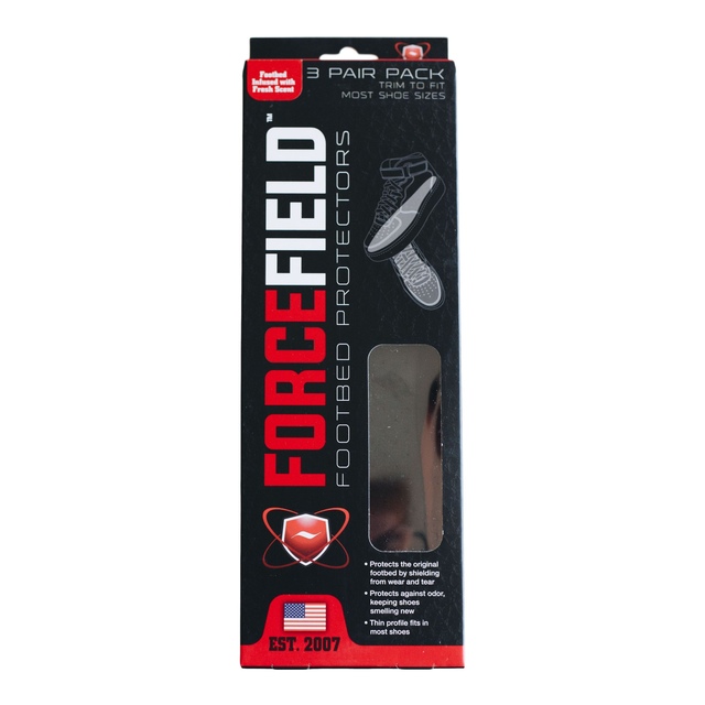 FORCEFIELD footbed protector insole 3 pack. Footbed protection: replaces original insoles to prevent wear and tear. Odour control: Silvadur™ technology inhibits the growth of bacterial odours. Customizable fit: trim-to-fit lines ensure precise sizing for any shoe. Thin profile: designed to fit seamlessly without crowding shoes. Convenient 3-pack: outfit multiple pairs of shoes with ease.