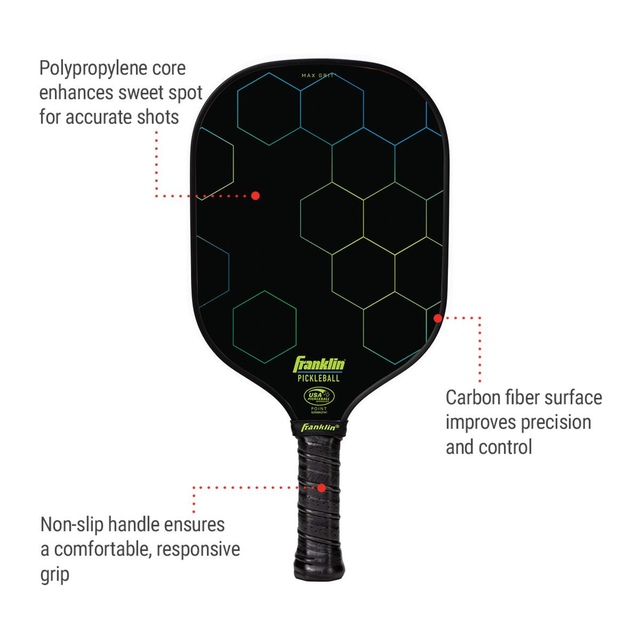 Dominate the court with the Franklin Senior Point Pickleball Paddle. Designed with a non-slip handle grip, this pickleball paddle offers a comfortable, responsive feel. The strong polypropylene core provides an ample sweet spot for powerful, accurate shots. Additionally, this Franklin pickleball paddle is approved by USA Pickleball for competitive and tournament play.