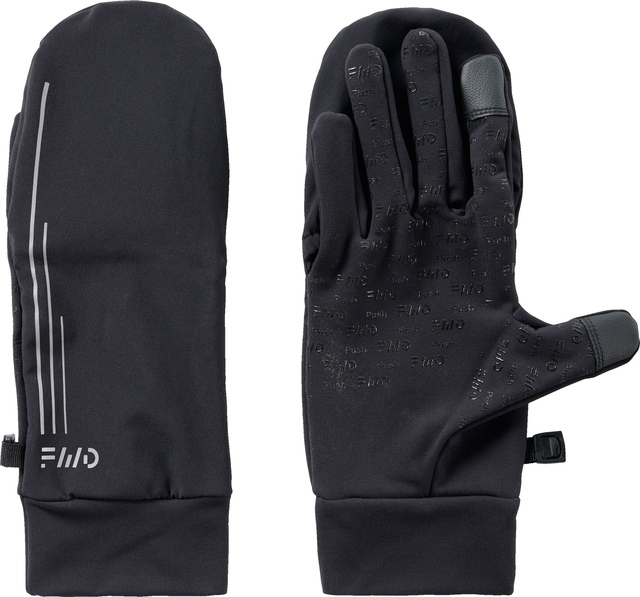 The FWD Men's Running Mitts deliver adaptable warmth with a convertible design, pairing a micro fleece glove with a fold-back woven mitt cover for changing conditions. The silicone grip palm, touch-screen compatibility, and secure clip connector provide essential functionality for cold-weather training.