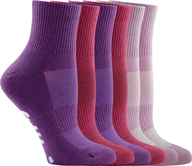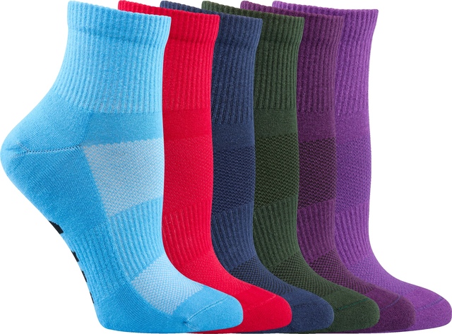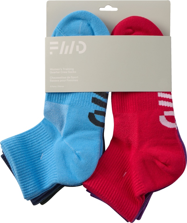 The FWD Women's Athletic Quarter Socks are designed for active lifestyles with cushioned comfort and moisture-wicking performance. These socks feature a cushioned sole and ribbed arch support to prevent fatigue, and the reinforced toe and heel ensure durability. With moisture-wicking fibres and an odour-resistant finish, these socks keep feet dry. The knit-in sizing detail on these athletic socks provides a comfy fit.