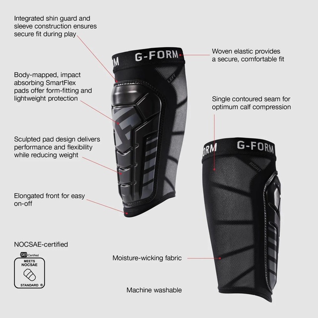 Integrated shin guard and sleeve construction ensures a secure fit during play