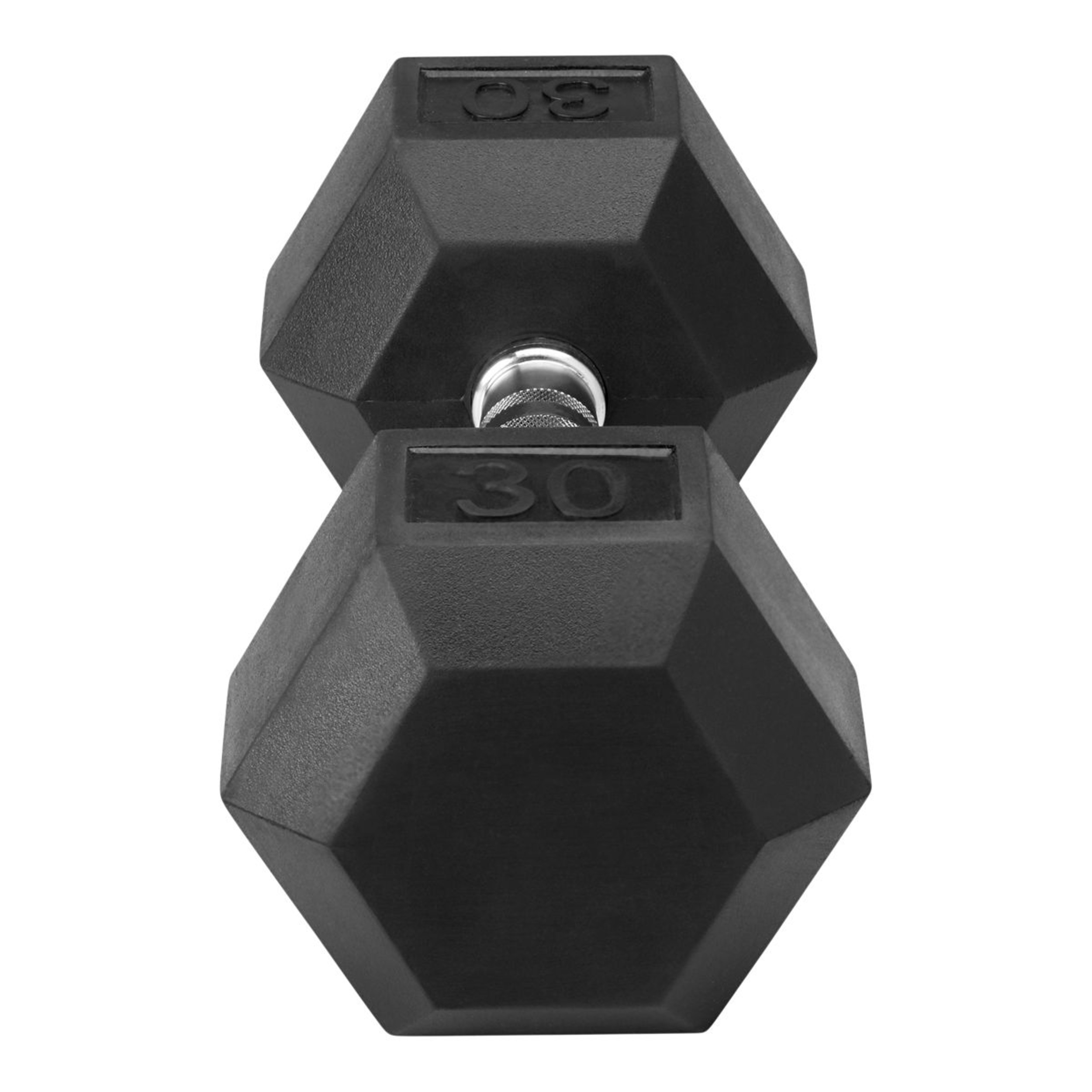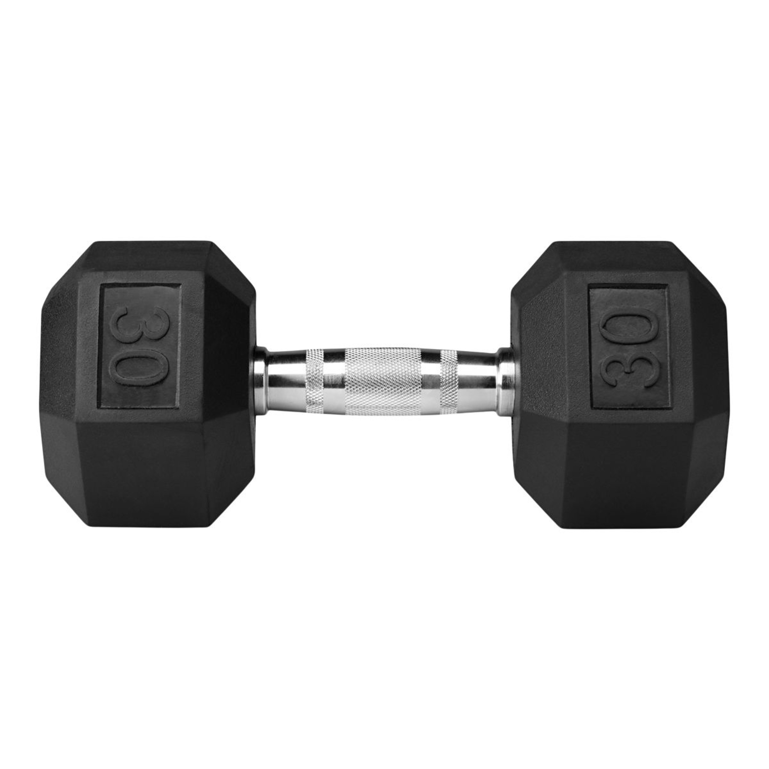Our Rubber Hex Hand Weights are quality-engineered, deluxe-grade dumbbells built to last a lifetime. Featuring black rubber-encased 8-sided heads that help prevent damage to flooring, a no-roll design that keep the dumbbells in-place when not in use and chrome contoured, non-slip handles for ultimate grip. These dumbbells are available in weights ranging from 3 to 30 pounds so they can be used for a variety of exercises and for any fitness level. Use these to perform front raises, upright rows, squat to overhead presses, push up rows, reverse flies, or any other upper body strengthening exercise. Each weight is sold separately.