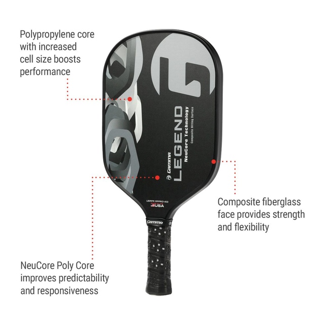 The Gamma Legend Pickleball Paddle delivers a high amount of power without compromising on touch or control. This pickleball paddle has a soft feel thanks to the 25% thicker Polymer NeuCore technology that absorbs shock from power shots. With a composite hitting surface and a comfortable grip, this paddle is perfect for those who enjoy a plush feel and added cushioning. This pickleball paddle weighs 8.1 oz, an excellent choice for players at an intermediate or advanced level.