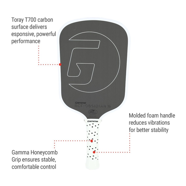 The raw carbon hitting surface of the Gamma Obsidian 16mm Senior Pickleball Paddle combined with unique tapered edges, encourages a high swing speed and quick reload while creating optimal spin. The 16 mm paddle has a control-oriented thick core designed to offer the feel and precision GAMMA paddles are known for, while the 13 mm paddle has a power oriented design.
