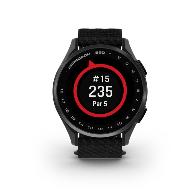 Got your game with Approach® S50, the Garmin Approach® S50 GPS Golf Watch that gives you what you need on the course and beyond. Its slim, lightweight design and ComfortFit nylon strap make it an easy all-day wear. Its bright 1.2” AMOLED display makes it easy to see key yardages to the green, hazards and doglegs on 43,000+ preloaded courses worldwide. With up to 10 days of battery life in smartwatch mode and 15 hours in GPS mode, you can play another round without having to stop and charge.