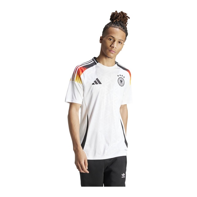 Embodying the spirit of German soccer. This adidas Germany home jersey combines all the symbols of the four-time world champions. An eagle feather-inspired design decorates the shoulders and embossed details taken from the DFB logo repeat across the front. Made for comfortable support, this shirt features moisture-managing AEROREADY and a woven badge. This product is made with 100% recycled materials. By reusing materials that have already been created, adidas helps to reduce waste and their reliance on finite resources and reduce the footprint of the products they make.