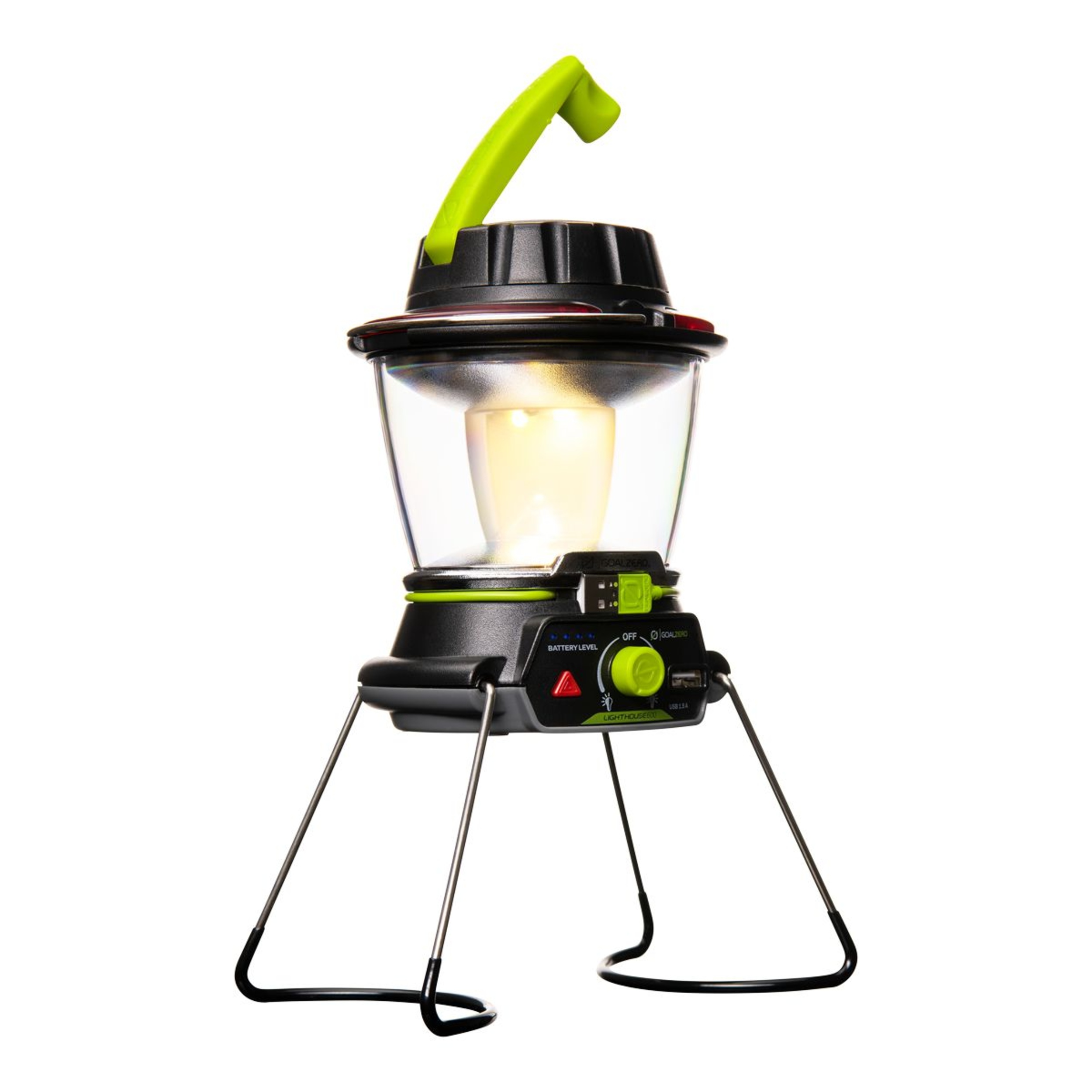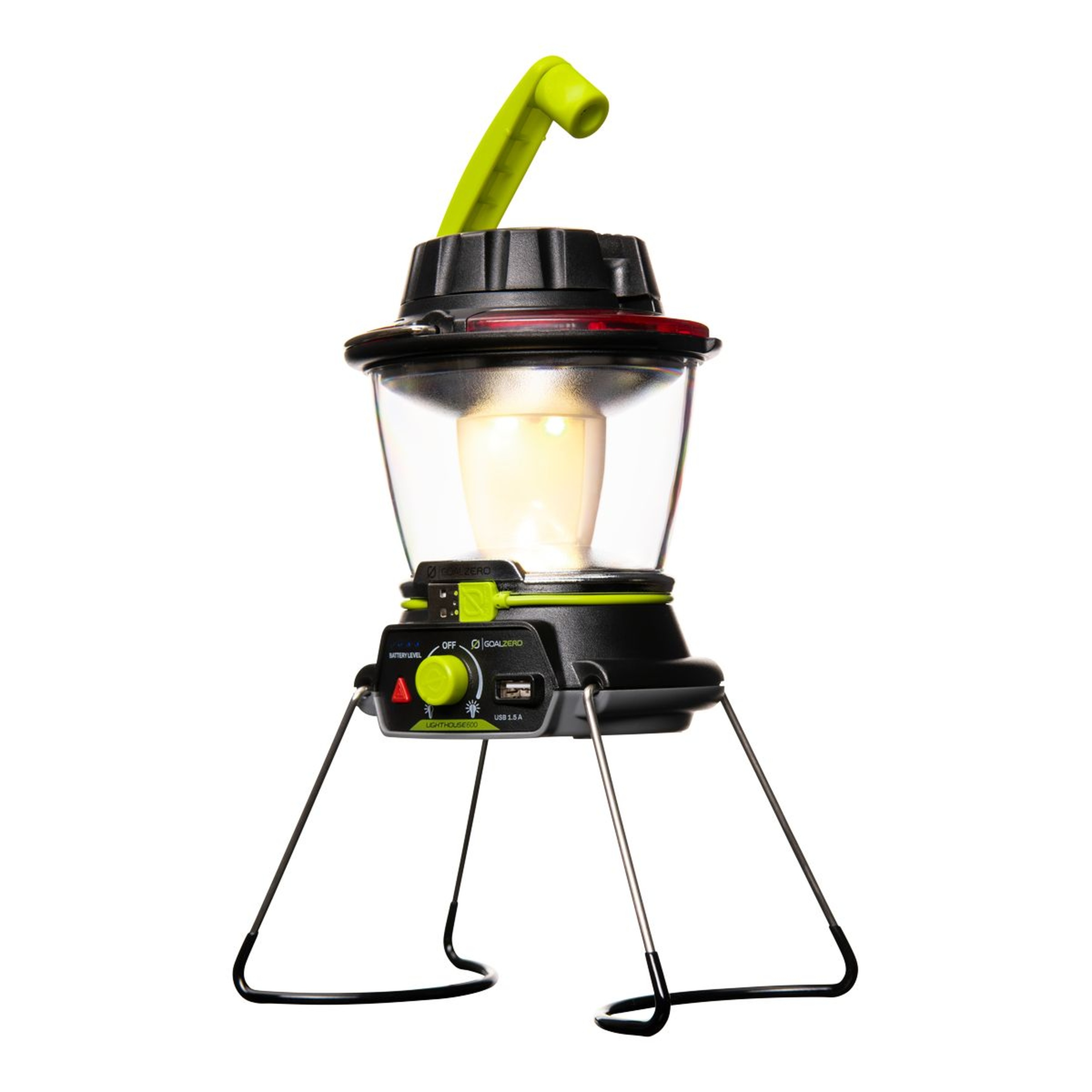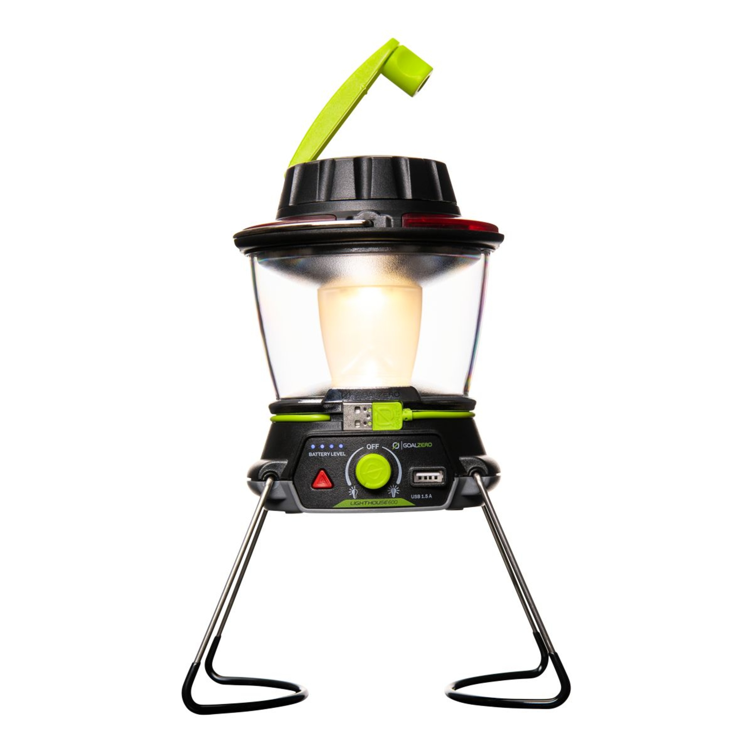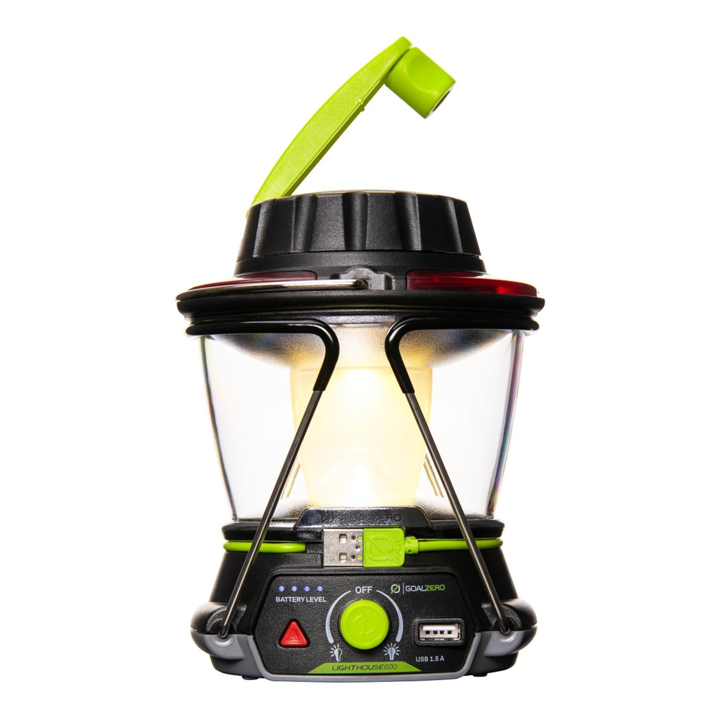 The Goal Zero Lighthouse 600 Camping Lantern is a multi-directional LED light with up to 600 lumens of brightness. The lithium battery powers the lantern for a long time and provides a USB output to charge devices like phones and tablets. The camping lantern with collapsible legs can be recharged with a solar panel, making it perfect for camping or long trips.