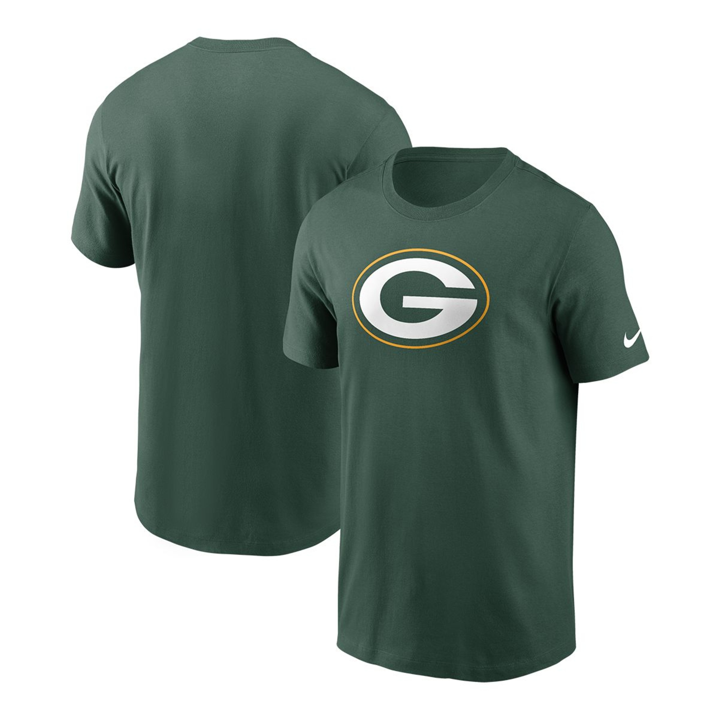 Green Bay Packers Nike Logo Essential Cotton tee with short sleeve crew neck and a graphic screen printed on the chest and the Swoosh screened on the left sleeve.