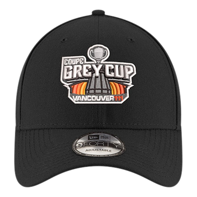 The Grey Cup New Era 111th 9FORTY Cap celebrates Canada's unique football heritage. This structured, adjustable cap features the official Grey Cup 111 logo with full-colour embroidery on the front panels. The black cap includes an adjustable Velcro strap for a customizable fit.
