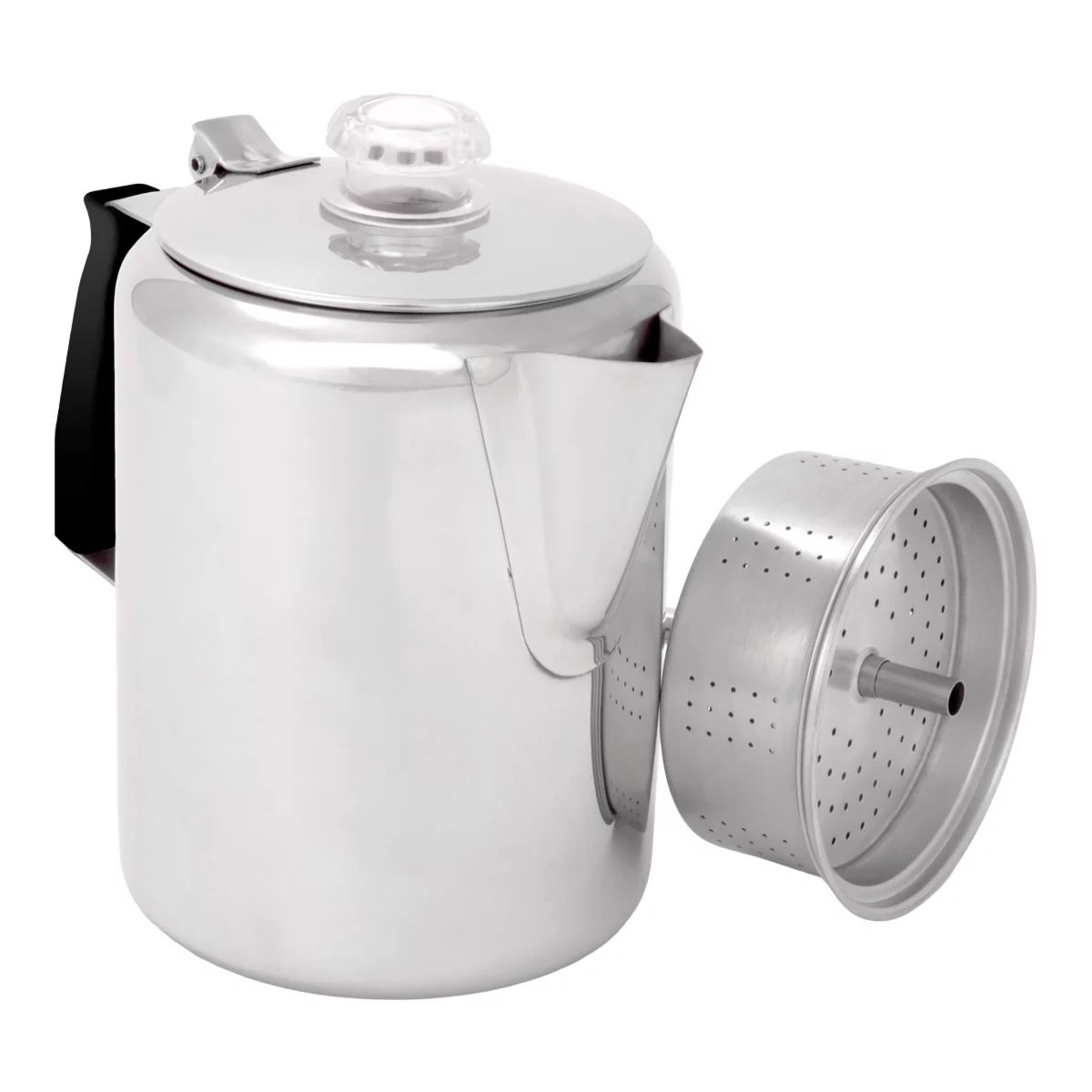 The GSI Glacier Stainless 9 Cup Coffee Percolator is a classic stovetop coffee maker made of stainless steel for long-lasting use and great flavour. Its resin PercView knob lets you monitor your brew, and the heat-resistant silicone handle ensures a secure, cool grip for easy pouring. This corrosion-resistant coffee maker is perfect for camping and outdoor activities.
