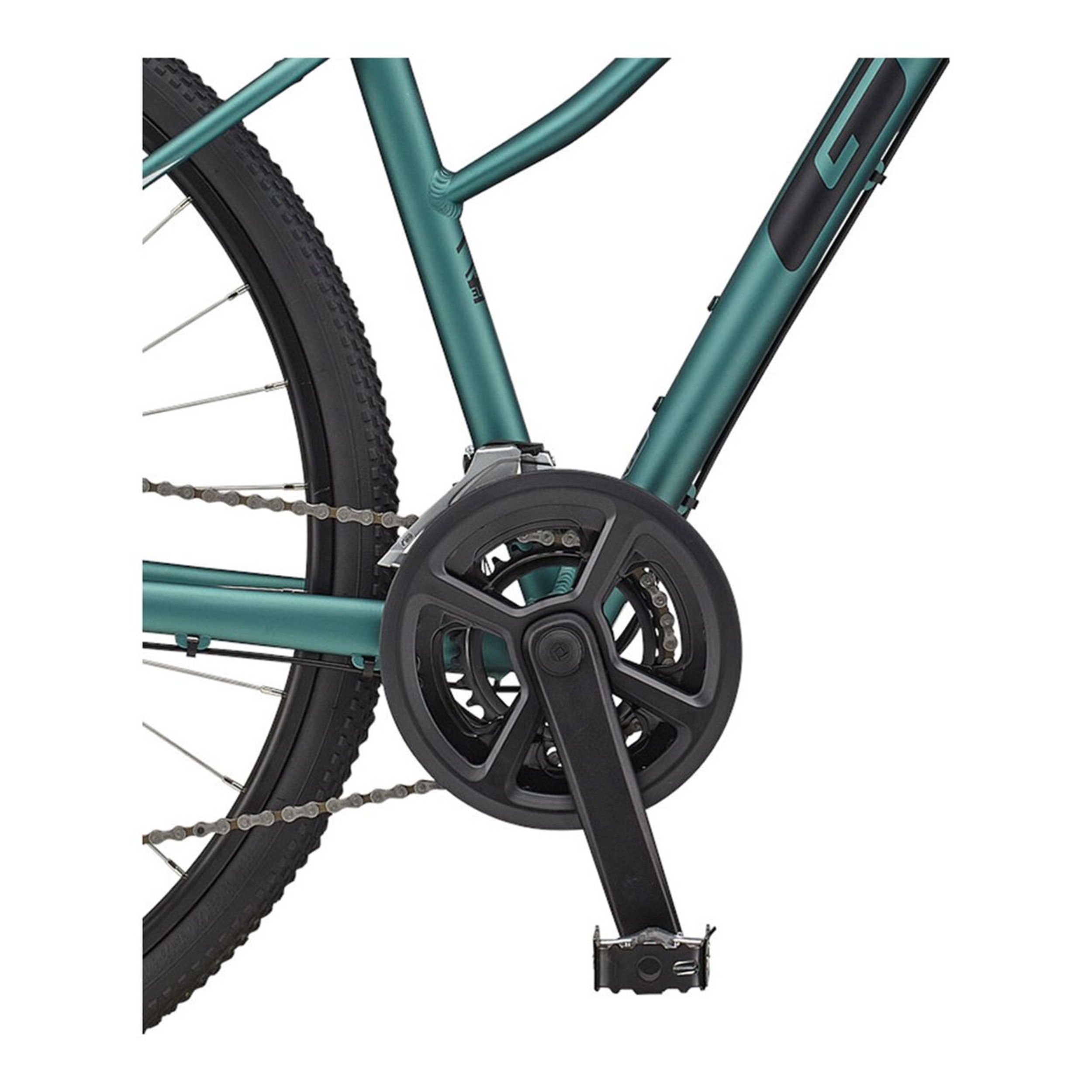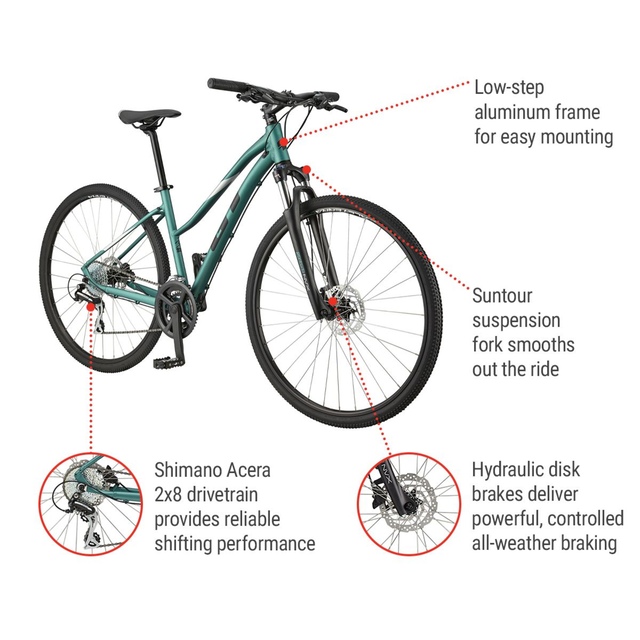 Glide through adventures with the GT Women's Transeo Elite Low-Step 700c 16 Speed Hybrid Bike. The low-step aluminum frame allows for easy mounting, while the suspension fork ensures a smooth ride. Equipped with Shimano gears and responsive disc brakes, this bike is ideal for commuting, errands, and weekend adventures, delivering comfort and performance on every ride.