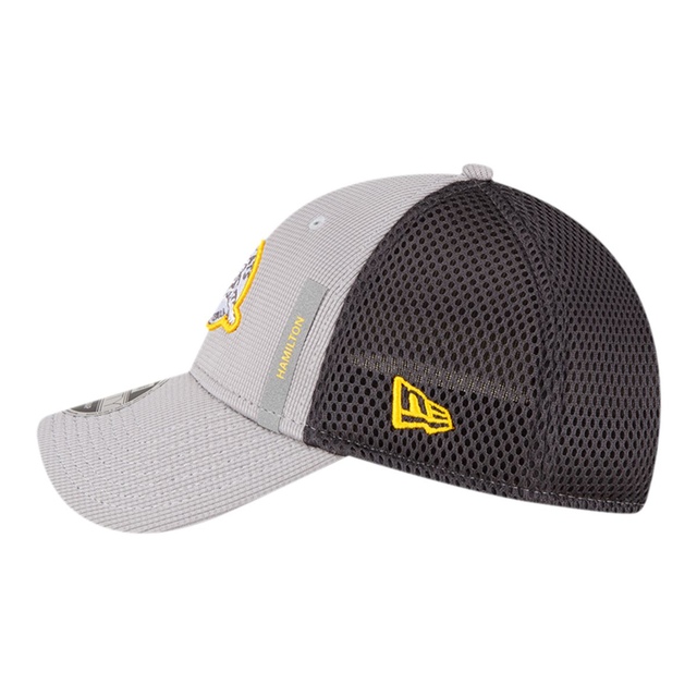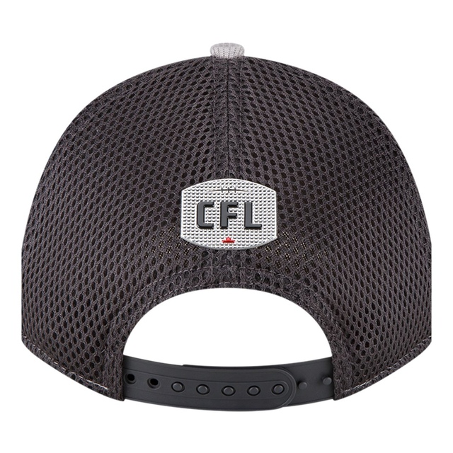 Hamilton Tiger Cats Sideline alternate cap. This 9FORTY stretch snap cap has grey pivot mesh front panels and visor along with graphite spacer mesh mid and rear panels. Ti-cats logo is embroidered in grey tonal colours with a team colour pop outline. This cap has a stretch headband for comfort an adjustable plastic bartack closure at rear. A metallic chrome CFL badge adorns the back of cap above closure.