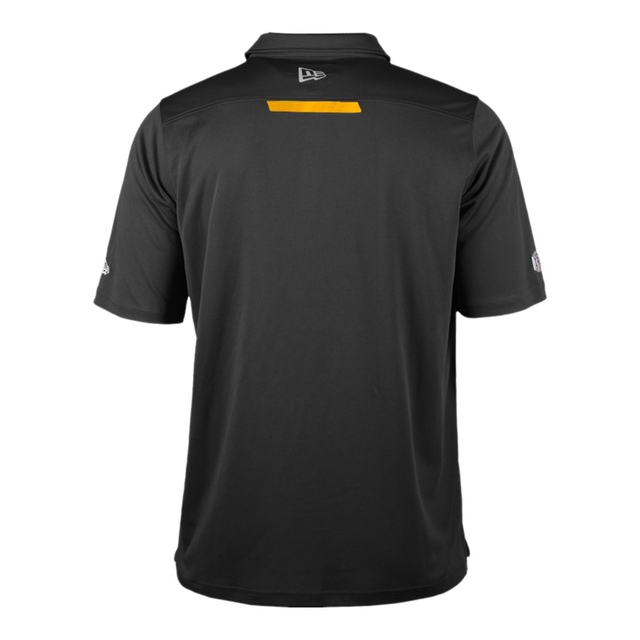 Hamilton Tiger-cats Sideline Roster polo shirt. Athletic cut, in poly performance honeycomb mesh. Team color with secondary team color features on placket and centre back between shoulders. Primary logo on front left chest. Also features CFL badge on left sleeve and reflective Official Sideline tab on bottom hem.