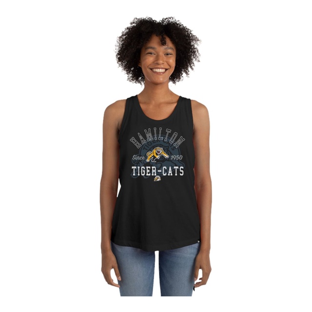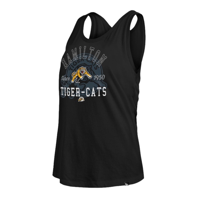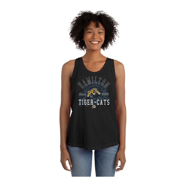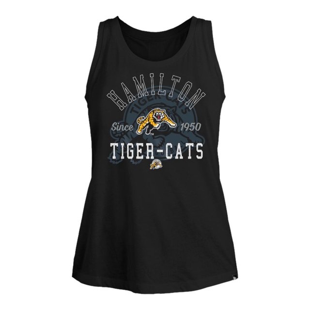 CFL - Hamilton Tiger Cats Women's tank top. Team color with split back. Tiger cats logo with football themed glitter print on front