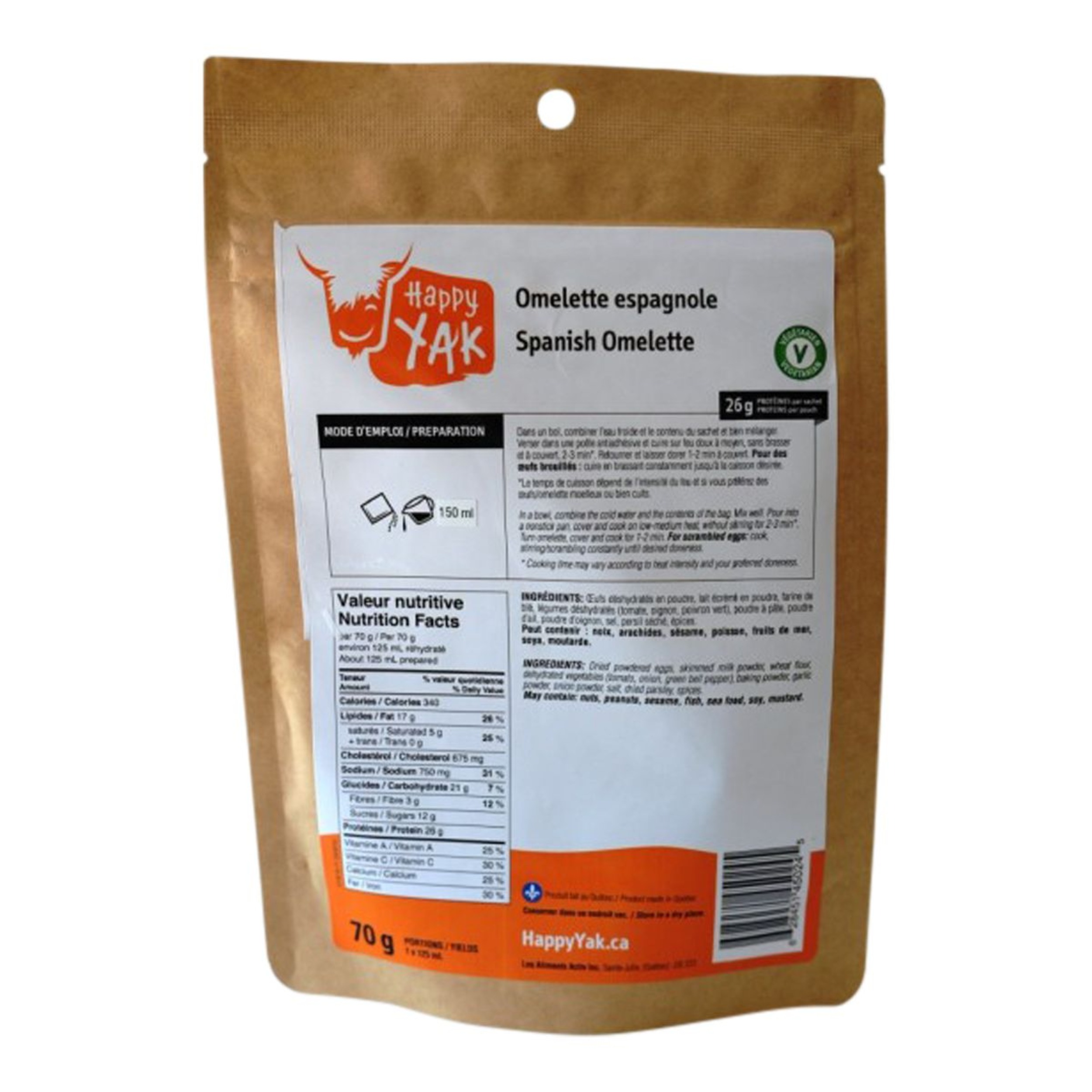 The Happy Yak Spanish Omelet Dehydrated Meal is a high-protein, Spanish-inspired meal. This dehydrated omelet features the flavours of garlic, onion, and spices. It contains 26g of protein and dehydrated vegetables like tomato, onion, and bell pepper. Just add water to prepare this delicious camp food, perfect for outdoor adventures.