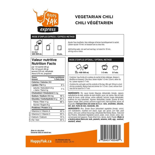 The Happy Yak Vegetarian Dehydrated Chili is a convenient and nutritious comfort food for outdoor adventures. Packed with flavourful ingredients like tomato sauce, kidney beans, corn, and rice, this hearty chilli is a satisfying meal that's both low in sodium and high in protein. Thanks to Happy Yak's DryVent™ technology, it stays fresh and delicious until you're ready to enjoy it. Its lightweight, dehydrated package is easy to pack and carry, making it perfect for backpacking, camping, or any outdoor excursion.