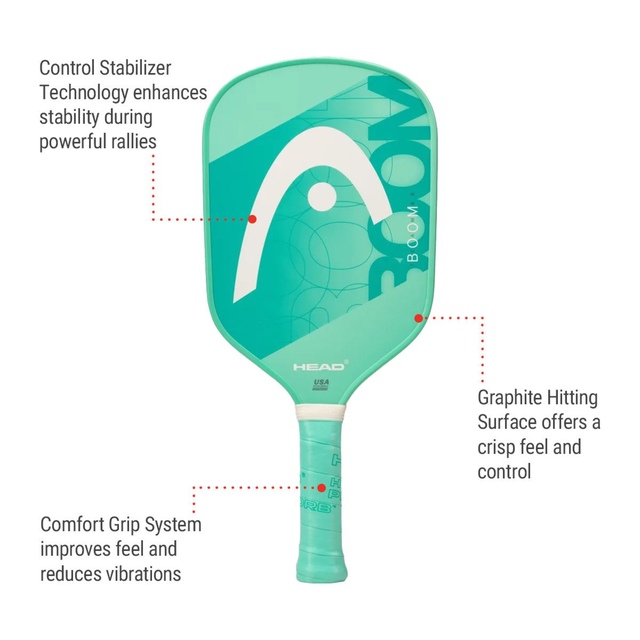 The Head Boom Team EX Senior Pickleball Paddle offers exceptional power and control, enhancing performance. Featuring a large sweet spot and a lightweight design, this paddle provides great maneuverability and precision. Its innovative construction helps players maintain stability and power, ensuring a dynamic, all-around game.