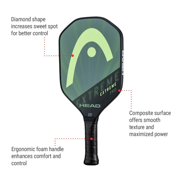 With a Composite Hitting Surface and a unique Diamond Shape, the Head Extreme Pro Pickleball Racquet offers increased power while still maintaining great control on every shot. This pickleball racquet incorporates a Comfort Grip for less vibration and a softer feel during play. The Control Stabilizer Technology (CST) optimizes the paddle's torsional stability and reduces vibrations. Plus, the engineered surface on this pickleball paddle provides increased comfort on impact and great playability.