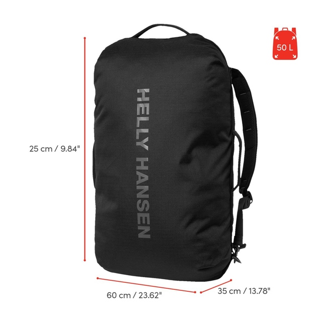 The Helly Hansen Canyon 50L Duffel Pack features adjustable shoulder straps for comfort and a mesh pocket under the lid for easy organization. This versatile HH bag conveniently folds down, storing neatly in its own pocket, making it an ideal choice for streamlined travel and outdoor adventures.