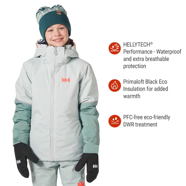 The Helly Hansen Juniors' Jewel Jacket combines performance and style for the slopes. Built with HELLY TECH® Performance construction, it delivers waterproof, wind-resistant, and breathable protection. PrimaLoft® Black Eco insulation ensures warmth, while the articulated cut allows for easy movement. Featuring a detachable hood, ski pass pocket, powder skirt, and reflective details for enhanced visibility, this jacket provides both functionality and all-day comfort.