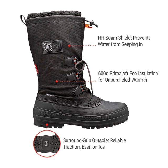 Helly Hansen Men's Arctic Patrol Winter Boots are designed for extreme outdoor conditions. They feature 600g Primaloft insulation, removable felt sock liners with faux Shearling tops, and aluminum shield blockers to help keep your feet warm. Coated textile uppers and sealed seams keep moisture out, ensuring comfort in wet climates. Enhanced with HH® technologies like FreezeBlock, Seam-Shield and Max-Grip, these HH Arctic Patrol boots offer excellent grip and temperature resistance, making them perfect for icy terrains.