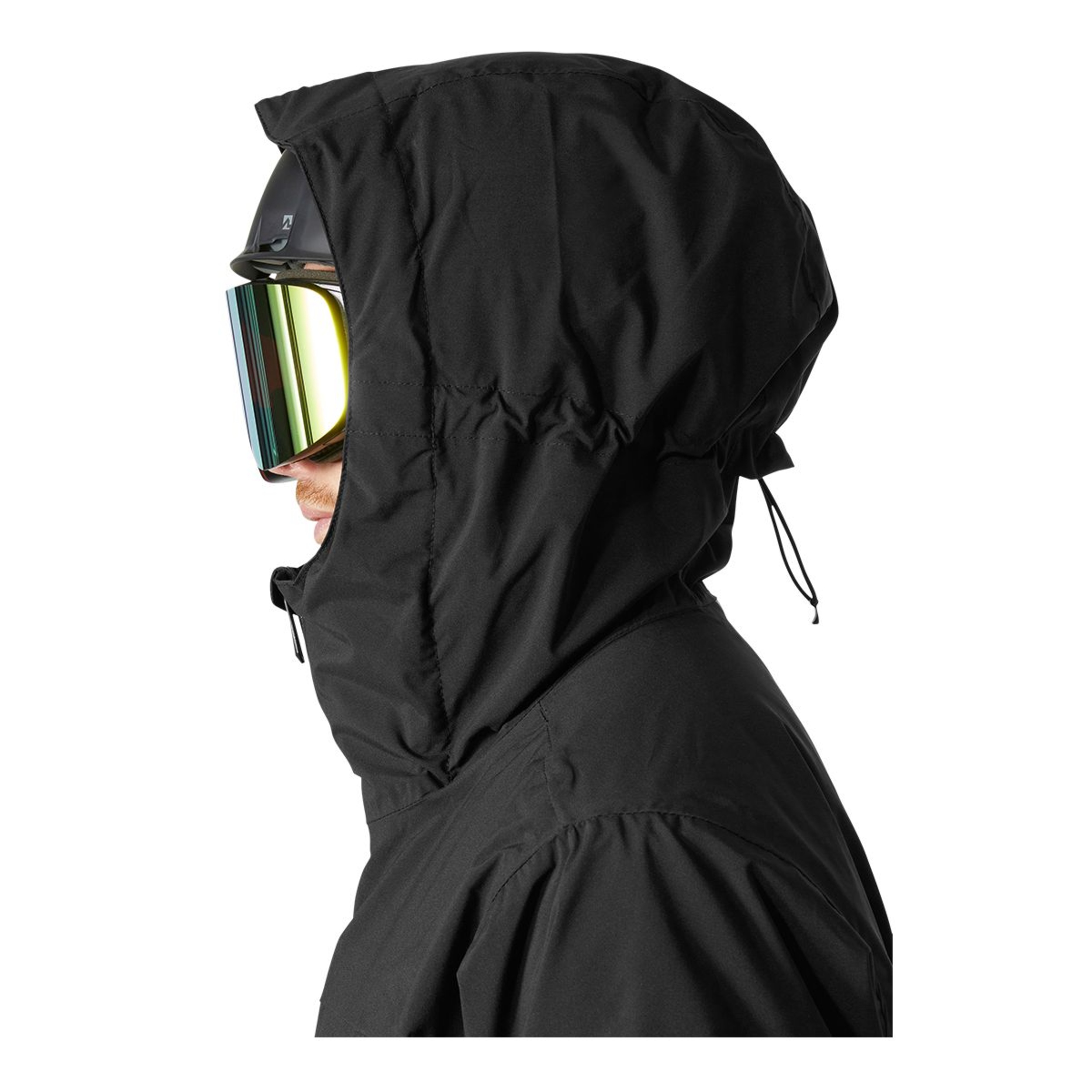 Helmet-compatible hood with a storm visor offers warmth with adjustable coverage