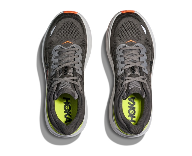 HOKA Men's Bondi 9 features a 3D molded collar, super critically foamed EVA, engineered mesh with 55% recycled polyester, reflective upper details, extended heel pull, smooth MetaRocker™, rearfoot-focused Active Foot Frame™, molded EVA sockliner, and Durabrasion rubber outsole.