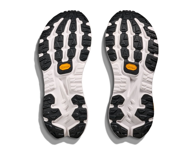HOKA Mafate X delivers supreme plushness with a dual-density, premium foam chassis, PEBA top layer, and a pop of propulsion thanks to HOKA's forked carbon fibre plate. The ultralight woven upper allows for easy drainage. The Vibram® Megagrip outsole with pod-like cutouts ensures a smooth ride over variable terrain. Additional features include a woven textile upper, patent-pending dynamic vamp, gusseted tongue, protective toe cap, moulded TPU heel counter, reflective details, smooth MetaRocker™, rearfoot-focused Active Foot Frame™, carbon fibre plate, PEBA core, super critically foamed EVA carrier, and SCF TPEE sockliner.