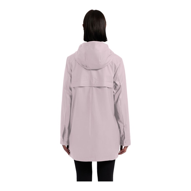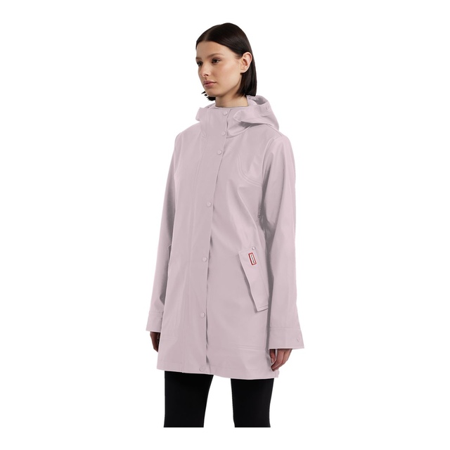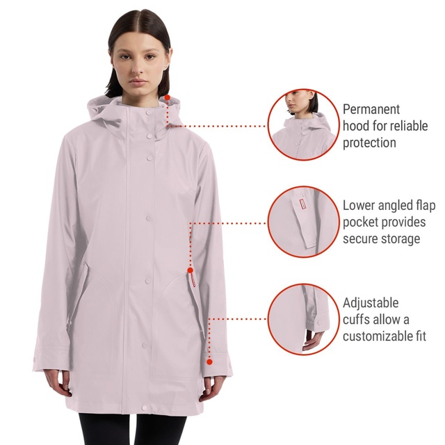 The Hunter Women's Acacia Rubber Rain Jacket is your go-to for wet weather. Designed with waterproof welded seams, it ensures you stay dry without sacrificing style. It features a hood for added protection and a convenient 2-way zipper with a snap placket for easy wear, combining practicality and elegance effortlessly.
