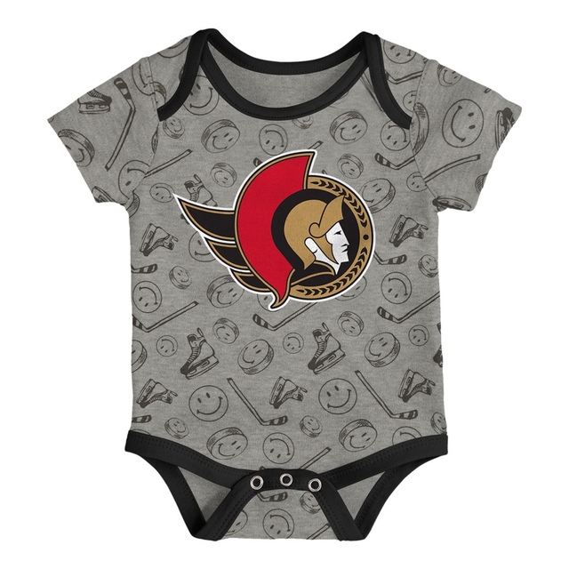 The Full Strength short sleeve three pack creeper set is super fun for any new NHL Fan. Team, alternate, and grey coloured creepers with hockey inspired graphics in their favorite team. Cotton interlock fabric with soft hand screen print application. Officially licensed by the NHL. Infant size range.