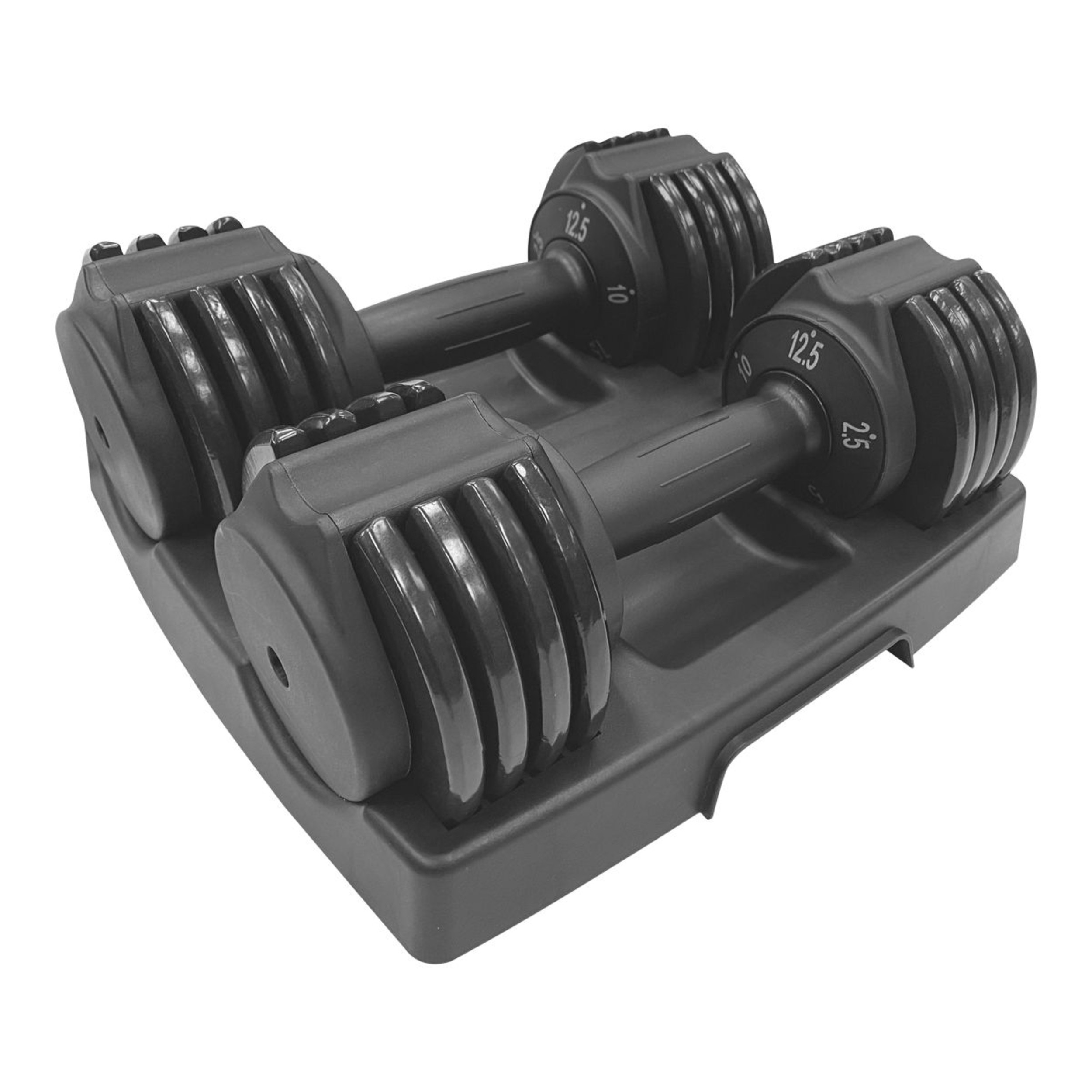 Online Only - Build muscle and tone your body with the IBF Iron Body Fitness 25 lb. (11.34 kg) adjustable dumbbell set. The two 12.5 lb. (5.67 kg) dumbbells adjust with a simple turn of the handle in 2.5 lb. (1.3 kg) increments. Adjust from 2.5 (1.3 kg) to 12.5 lbs. (5.67 kg) each. Replace five sets of dumbbells with one! Ideal for home workouts, the easy-to-use set comes with a heavy-duty docking base for securely adjusting your weights and convenient storage.