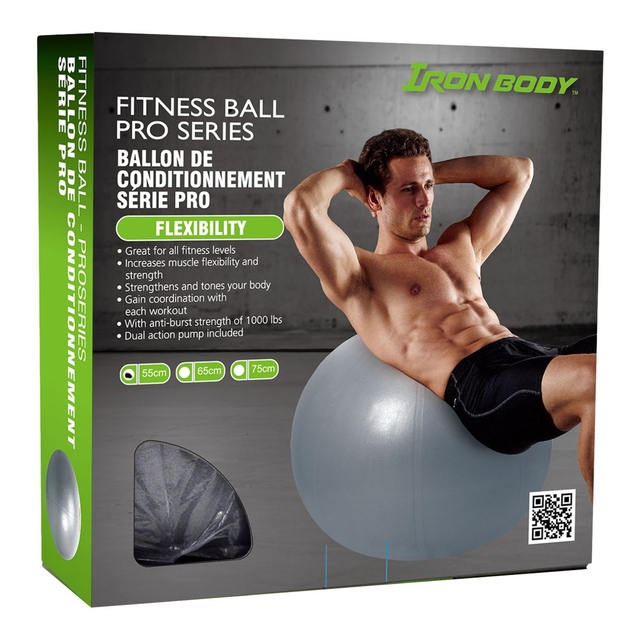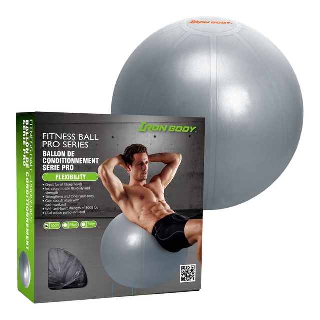 Use the IBF Iron Body Fitness Pro Series fitness ball to perform a range of exercises to build muscle strength, and improve your flexibility, balance, and coordination. Replace your chair with the ball for a passive workout that improves your posture and tones your body. Its anti-burst design ensures the ball won't burst if punctured, instead, it will deflate slowly. Inflate and deflate with the included pump.