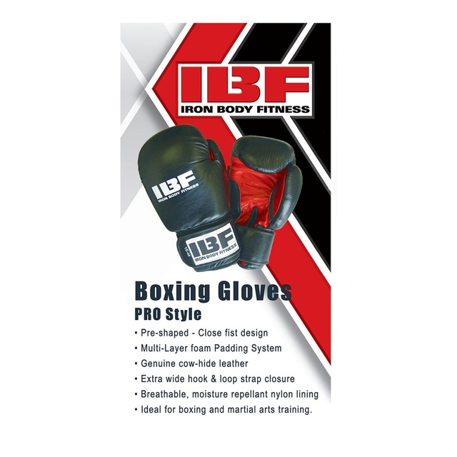 These 16 oz. IBF Iron Body Fitness Pro Series boxing gloves feature a genuine cowhide leather shell with reinforced stitching and AIBA (International Boxing Association) approved padding to endure the toughest Boxing and MMA workouts. They have a breathable, moisture-repellent inner lining. The extra-wide adjustable strap makes them a one-size-fits-all glove, offering the protection, comfort, and performance you expect from IBF Iron Body Fitness.