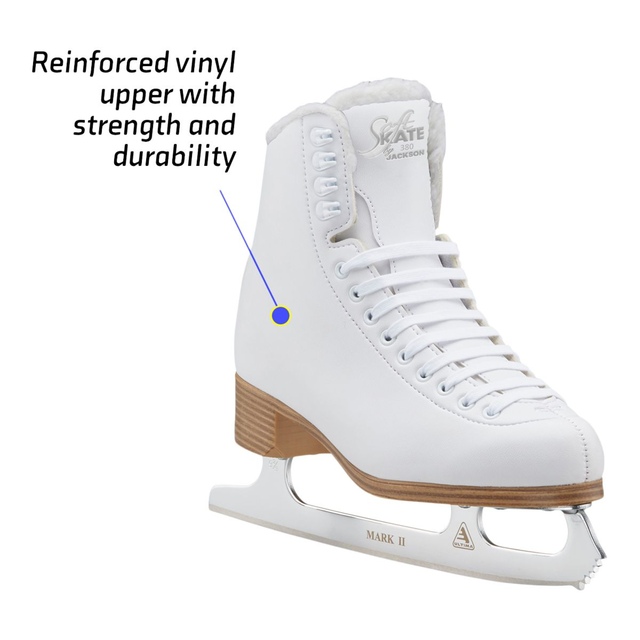 The Jackson 381 Soft Girls' Figure Skates combines the luxury and warmth of traditional white figure skate with superior comfort from first try-on. The stainless steel blade is perfect for beginners. With padded covered tongue and thick soft padded rolled collar, these medium recreational skates offer support, warmth, and comfort. Online only.